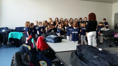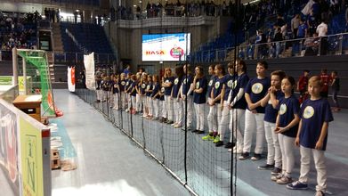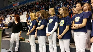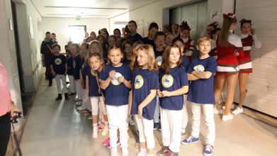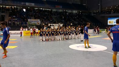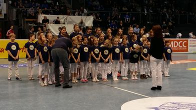 Erwartungsvoll warteten unsere Kinder darauf, endlich auf das Spielfeld zu dürfen und zu singen. Das Lied ist inzwischen so bekannt, dass das gesamte Publikum mitgesungen hat.