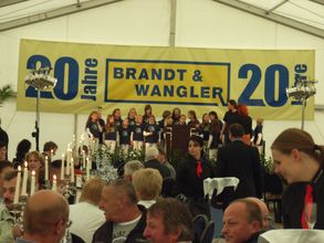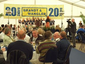 Am 02.10.2010 waren wir zur Jubiläumsfeier der Firma Brandt und Wangler eingeladen. Zu ihrem 20-jährigen Bestehen gab die Firma auf ihrem Gelände eine großen Empfang. Unser Chor durfte die Veranstaltung eröffnen. Dies erfolgte mit dem Lied "Herzlich Willkommen", welches immer wieder ein guter Einstieg ist. Natürlich durfte bei unserem Auftritt auch nicht das Magdeburger Lied fehlen. Frau Meier übergab in diesem Zusammenhang auch Herrn Wangler ein Exemplar unserer CD des Magdeburger Liedes. Bei einem "Wettstreit", ob unser Chor oder die geladenen Gäste besser dieses Lied singen, hat eindeutig unser Chor gewonnen. Leider haben sich die Gäste nicht so richtig mitziehen lassen.